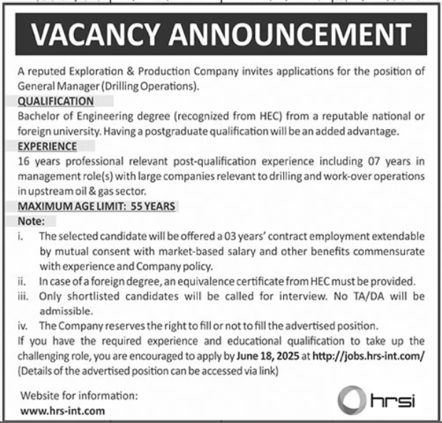 Human Resource Solutions International HRSI is looking for candidates for following posts as per job advertisement published in daily Jang Newspaper of June 3, 2025 for location Karachi, karachi Sindh Pakistan: