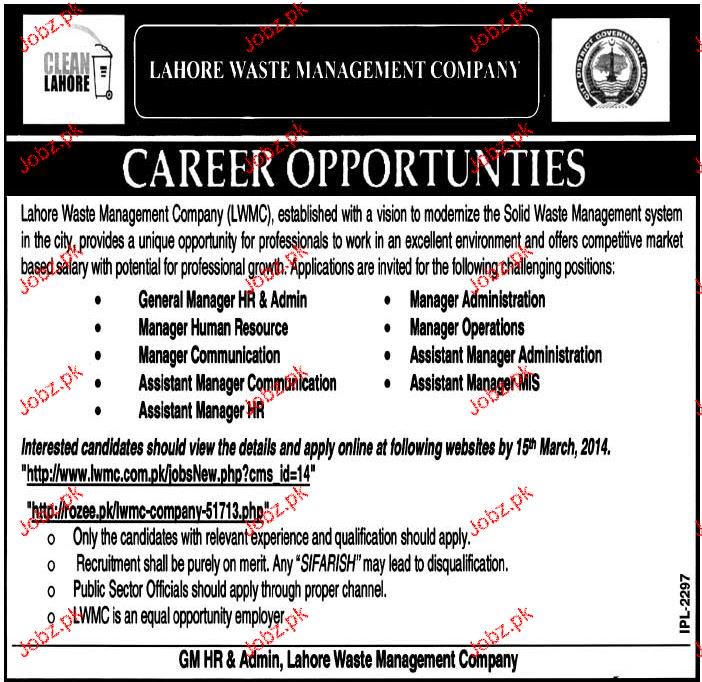 General Manager HR, Manager HR Job Lahore Waste Management