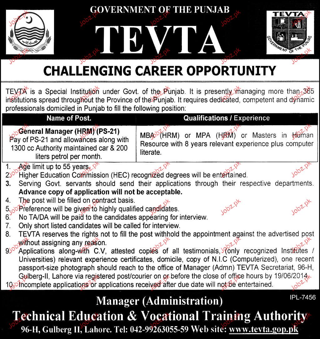 General Manager HRM Job In TEVTA