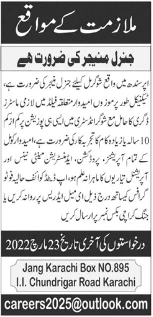 Sugar Mill Karachi, karachi Sindh Pakistan invites applications from eligible candidates for the post of general manager as per advertisement of March 7, 2022 published in daily Jang Newspaper. Preferred Education is Master etc.