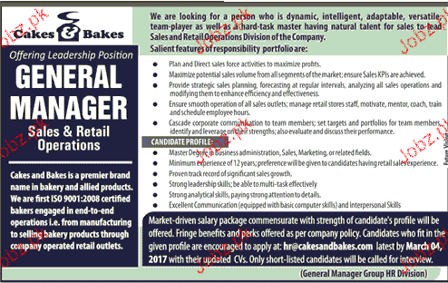 General Manager is required in Cake & Bakers in Lahore.