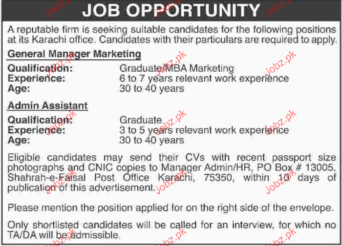 Apply as per details in job advertisement. Login to view further details of how to apply via https://www.jobz.pk online.