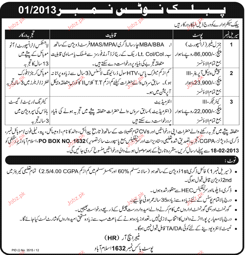 Apply as per details in job advertisement. Login to view further details of how to apply via https://www.jobz.pk online.