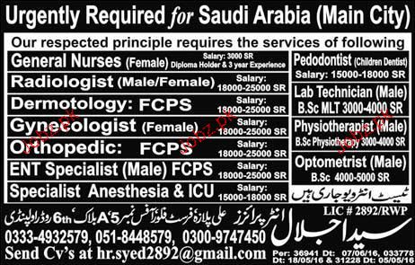 General Nurses, Gynecologists, ENT Specialists, Dertamologists and Orthopedics are required in Saudi Arabia.
