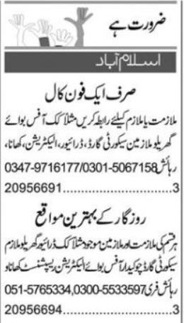 Private Company jobs advertisement dated about 27 December 2024 in daily Express Newspaper invites application for the vacant post of electrician, cook, security guard, driver, house servant, office bot and receptionist in Islamabad, islamabad Islamabad Pakistan. Educational qualifications required Master, Matric, Intermediate, Bachelor and Middle etc.