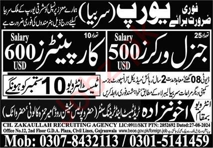 CH Zakaullah Recruiting Agency Europe, europe Europe invites applications from eligible candidates for the post of carpenter and general worker as per advertisement of September 8, 2024 published in daily Express Newspaper. Candidates with Middle and Matric etc. educational background will be preferred.