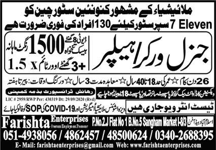 Farishta Enterprises Oversea Employment Promoters is looking for candidates for following posts as per job advertisement published in daily Express Newspaper of July 15, 2022 for location Malaysia: