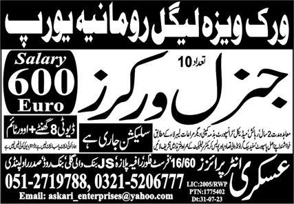 Askari Enterprises Romania, romania Romania invites applications from eligible candidates for the post of general worker as per advertisement of February 10, 2024 published in daily Express Newspaper. Persons with Middle, Matric and Intermediate etc. education can apply.
