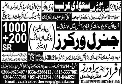 Afraz & Brothers International invites applications for job positions advertised in daily Express dated 4 November 2024 for following vacancies in Saudi Arabia, saudi arabia Saudi Arabia.