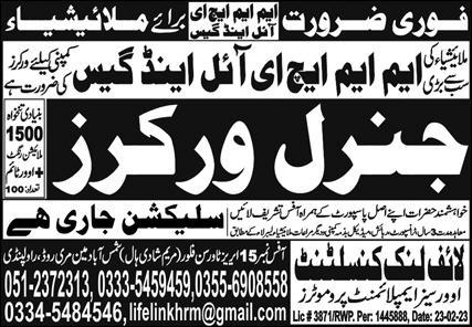 Life Link Consultant Overseas Employment Promoters Malaysia, malaysia Malaysia invites applications from eligible candidates for the post of general worker as per advertisement of March 23, 2023 published in daily Express Newspaper. Matric etc. educational qualification will be preferred.