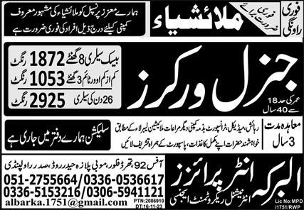 Vacant posts including general worker are announced in Al Barka Enterprises Malaysia, malaysia Malaysia as per 17 November 2023 advertisement in daily Express Newspaper. Educational qualifications required Matric, Intermediate and DAE etc.