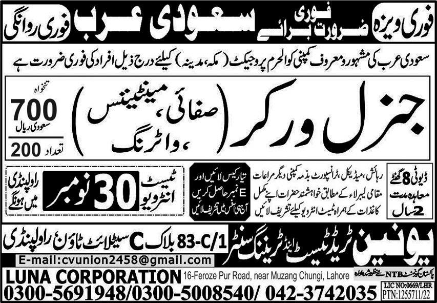 Union Trade Test and Training Center invites applications for job positions advertised in daily Express dated 11 November 2022 for following vacancies in Madina, makkah Saudi Arabia.