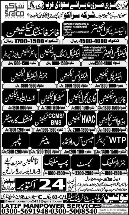 Vacant posts including electrical lighting poles technician, mechanical technician, wtp operator, ccms technician, generator electrical technician, engineer, boiler operator, electronics engineer, mason, painter, lift technician, boiler technician, electrical technician, agriculture technician, generator mechanic, plumber, fire alarm technician, hvac technician, finishing carpenter, elevator technician, pump mechanic, chemist, electronics technician, bms technician and home appliances technician are announced in Union Trade Test and Training Center Riyadh, dammam Saudi Arabia as per 17 October 2025 advertisement in daily Express Newspaper. Persons with DAE, Intermediate, Matric, Bachelor and B.E etc. education can apply.