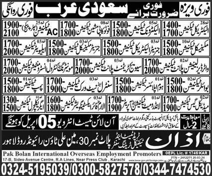 Azan Trade Test Center Dammam, riyadh Saudi Arabia invites applications from eligible candidates for the post of Pump Technician, Boiler Technician, Sewerage Treatment Plant Technician, Electrical Technician, Mechanical Technician, Ac Technician, Home Appliances Technician, Monitoring Technician, Photocopy Machine Technician, Medical Gas Technician, Agriculture Technician, Generator Mechanical Technician, Instrumentation Technician, Elevator Technician, Central Technician, Chiller Technician, Electronic Technician, Central Network Technician and Generator Electrical Technician as per advertisement of April 4, 2024 published in daily Express Newspaper. Educational qualifications required DAE, Matric, Bachelor, BA, Intermediate and B.E etc.