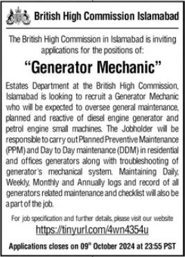 Generator Mechanic Jobs 2024 in British High Commission