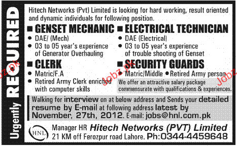 Genset Mechanics, Clerk, Electrical Technicians Required