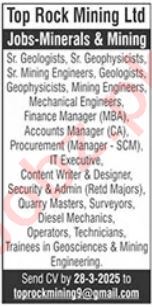 Top Rock Mining Limited is looking for candidates for following posts as per job advertisement published in daily The News Newspaper of March 16, 2025 for location Karachi, karachi Sindh Pakistan: