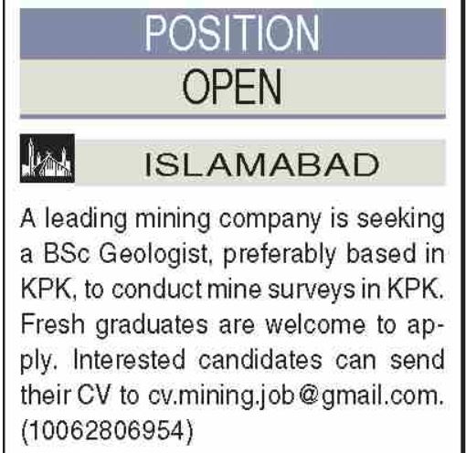 Mining Company jobs advertisement dated about 11 February 2025 in daily Dawn Newspaper invites application for the vacant post of geologist in Peshawar, peshawar Khyber Pakhtunkhwa KPK Pakistan. Others etc. educational qualification will be preferred.