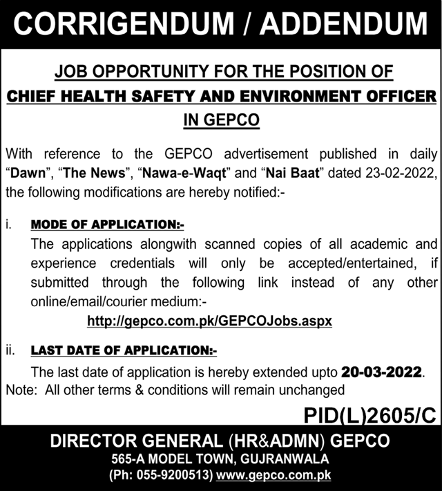 Gujranwala Electric Power Company GEPCO Gujranwala, gujranwala Punjab Pakistan invites applications from eligible candidates for the post of environment officer and chief health safety officer as per advertisement of February 26, 2022 published in daily Nawaiwaqt Newspaper. Master and Bachelor etc. educational qualification will be preferred.