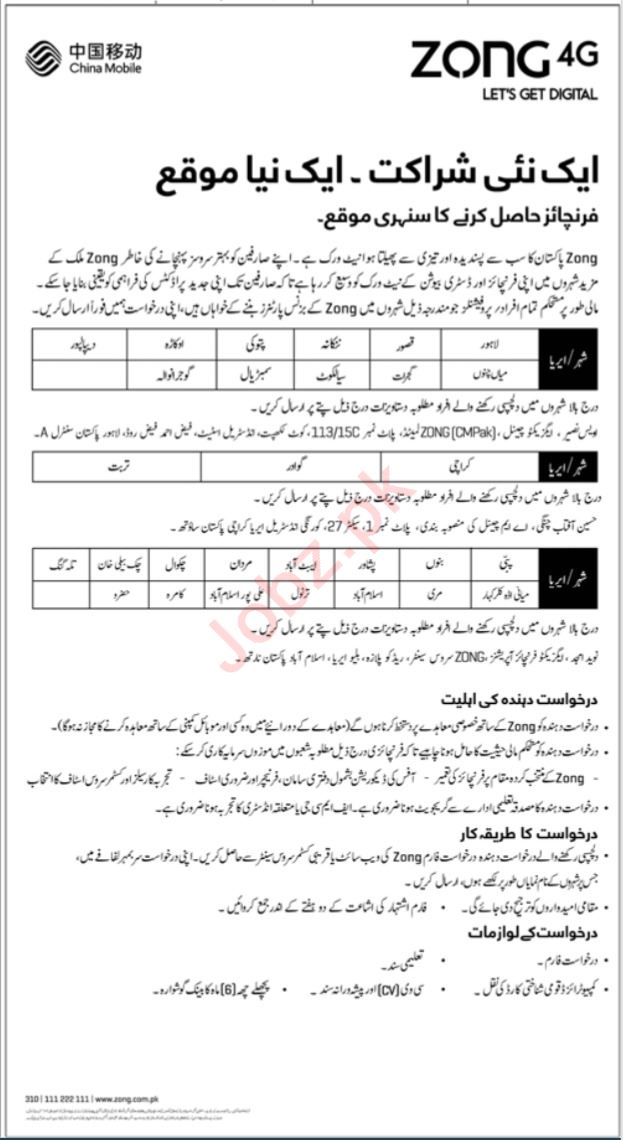 Zong Pakistan jobs advertisement dated about 16 October 2022 in daily Jang Newspaper invites application for the vacant post of franchisers in Lahore, gujranwala, gwadar, karachi, talagang, mian channu, depalpur, islamabad, sialkot, turbat, peshawar, murree, gujrat, abbottabad, bannu, mardan, pattoki, chakwal, kasur, okara, nankana sahib and lahore Punjab Pakistan. Educational qualifications required Master and Bachelor etc.
