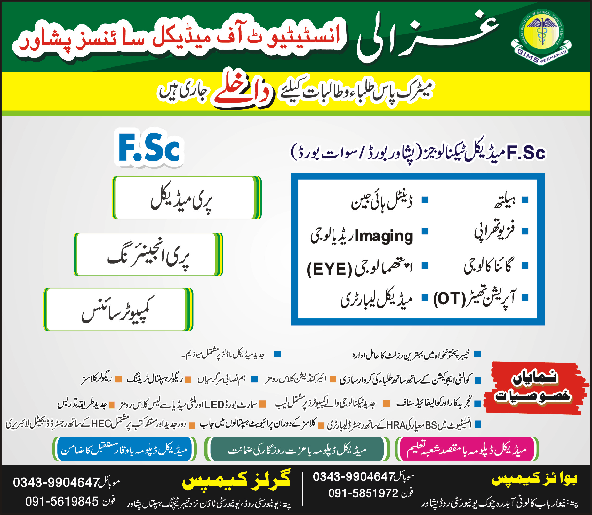 Ghazali Institute of Medical Sciences GIMS Peshawar, Pakistan are started admissions fall 2019 for the classes of FA Fine Arts, I Com, ICS, F Sc Pre Medical & Pre Engineering. Read newspaper ad for exact details.