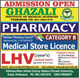 Admissions in Ghazali Institute of Medical Sciences 2022 for B Pharmacy, LhV Diploma has been announced. Eligible students who qualify as per admission criteria in Ghazali Institute of Medical Sciences Peshawar Khyber Pakhtunkhwa KPK Pakistan can apply in Medical Medical College for academic year 2022. Eligible students for fulfilling criteria for admissions in Course, B Pharmacy and Diploma can enroll as per Private admission policy 2022 till closing date 8 March 2022. Read newspaper ad for exact details.