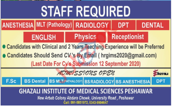 Ghazali Institute of Medical Sciences GIMS Peshawar, Pakistan is seeking candidates for the posts of Professor, Associate Professor, Assistant Professor, Lecturer, Anesthesia Professor, MLT Pathology Professor, Radiology Professor, DPT Professor, Dental Professor, Professor English, Professor Physics, Receptionist.