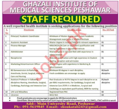 A well reported health institute Ghazali Institute of Medical Sciences is seeking applications from highly qualified and well educated individuals for the positions of Principal, Academic Coordinator, Academic Assistant, Finance Manager, Administrator, Receptionist, Marketing Officer, Assistant Professor, Lady Health Visitor LHV and Librarian in Peshawar KPK 2019.