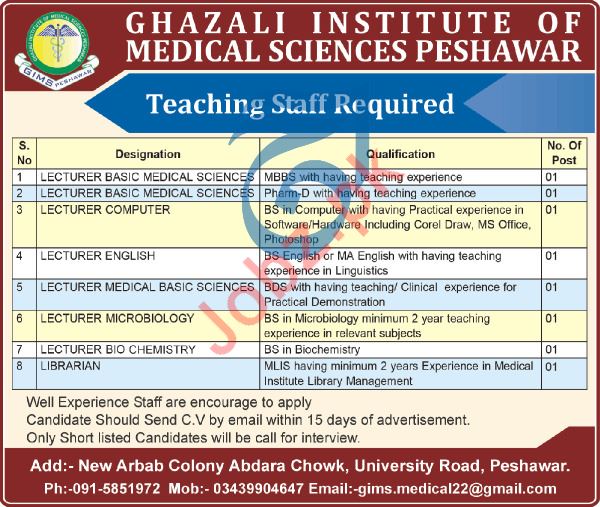 Ghazali Institute Of Medical Sciences Peshawar Lecturer Jobs