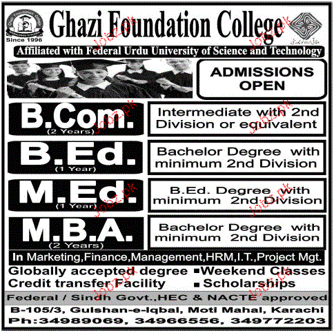 Ghazi Foundation College Admission in B.Com, B.Ed.MBA, B.Com. B.Ed, M.Ed and MBA in Karachi. Read newspaper ad for exact details.