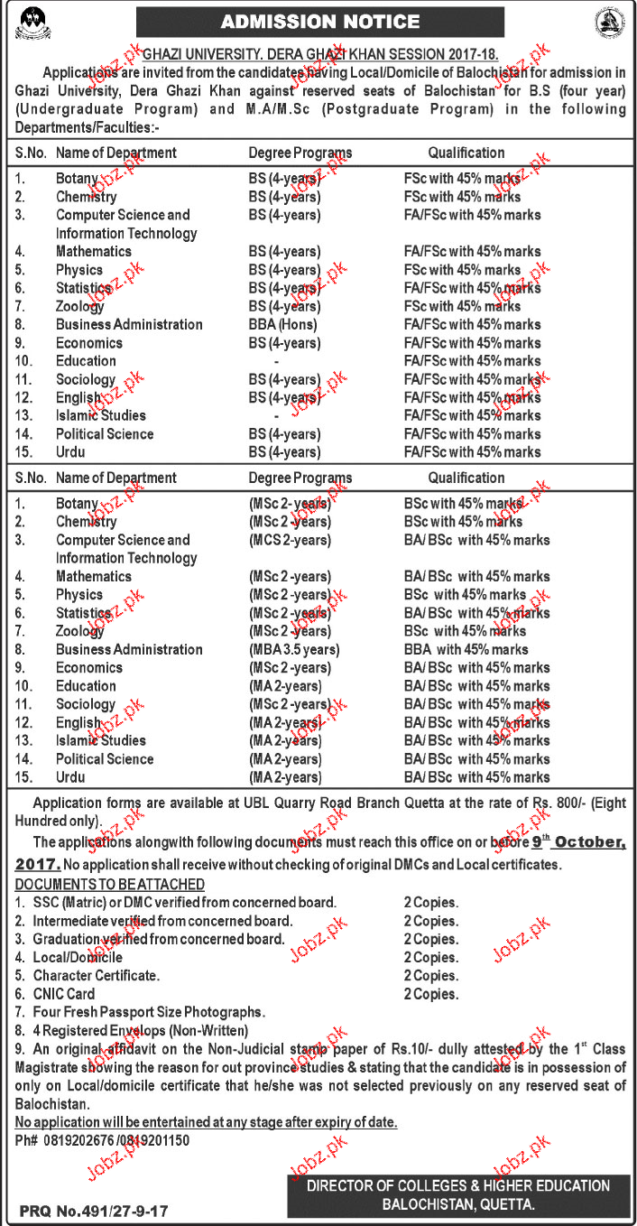 Ghazi University Deara Ghazi Khan Admission in BS in D G Khan. Read newspaper ad for exact details.