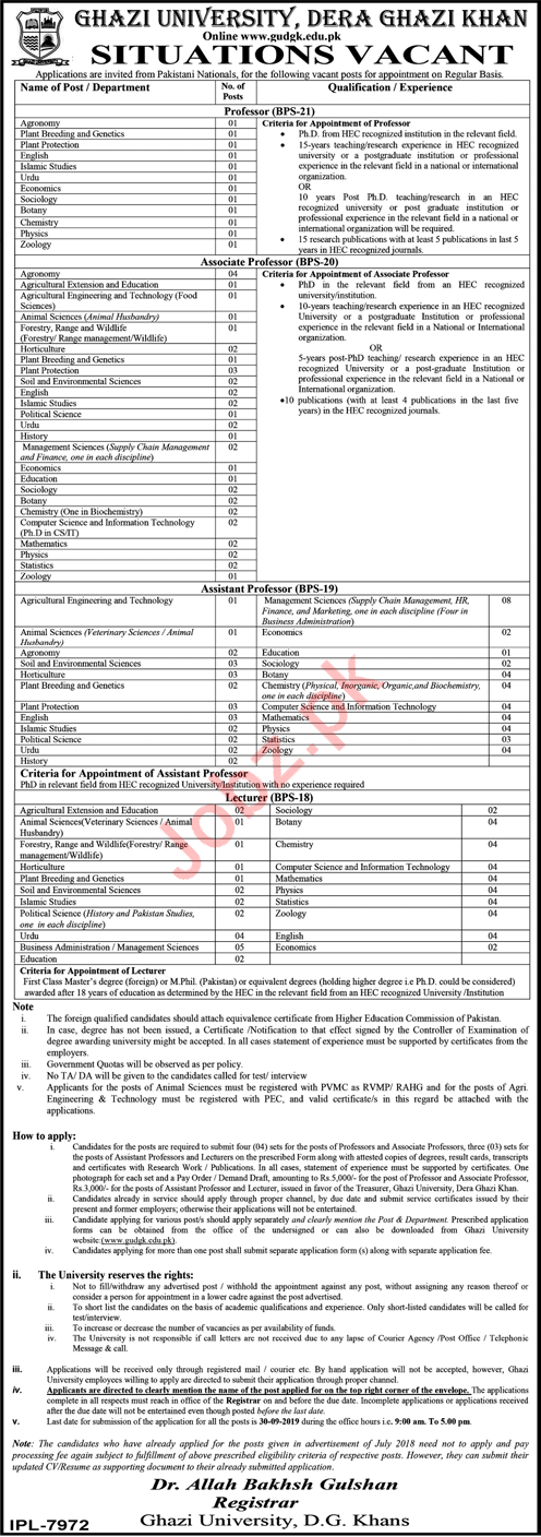 Vacancies in Ghazi University Advertisement September 2019