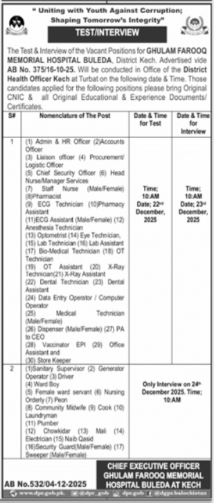 Ghulam Farooq Memorial Hospital Buleda jobs advertisement dated about 5 December 2025 in daily Jang Newspaper invites application for the vacant post of head nurse, ot technician, ecg technician, sweeper, nurse, lab technician, community midwife, pa to ceo, computer operator, store keeper, dental technician, optometrist, driver, nursing orderly, plumber, pharmacist, security guard, x ray assistant, female ward servant, sanitary supervisor, chowkidar, generator operator, vaccinator epi, ward boy, bio medical technician, liaison officer, female dispenser, mali, female security guard, hr officer, dispenser, chief security officer, staff nurse, male staff nurse, pharmacy assistant, eye technician, personal assistant, lab assistant, data entry operator, electrician, procurement officer, logistic officer, female sweeper, admin officer, x ray technician, ecg assistant, peon, cook, laundryman, accounts officer, manager nursing services, dental assistant, anesthesia technician, office assistant and medical technician in Kech, kech Balochistan Pakistan. Preferred Education is Master, Bachelor, Intermediate, Matric and MS etc.