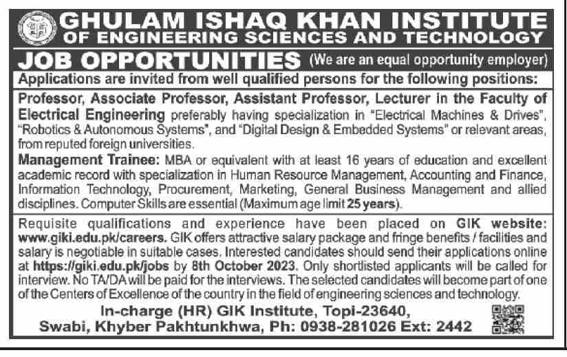 Ghulam Ishaq Khan Institute of Engineering Science and Technology latest Private Education jobs and others can be applied till 8 October 2023 or as per closing date in newspaper ad. Read complete ad online to know how to apply on latest Ghulam Ishaq Khan Institute of Engineering Science and Technology job opportunities.