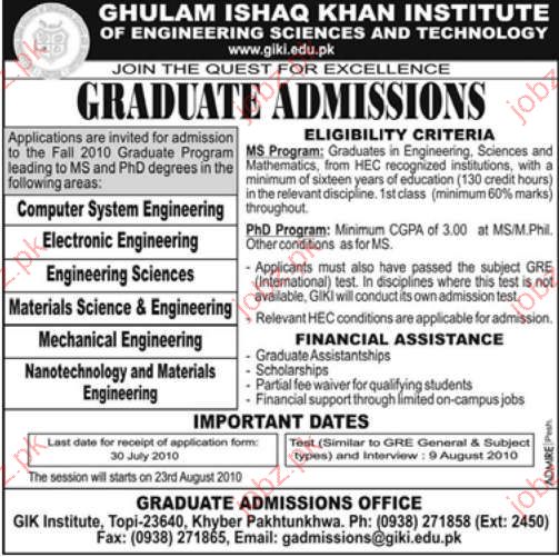 Ghulam Ishaq Khan Institute of Technology Admissions in computer System Engineer, Electronic Engineering, Engineering Sciences, Mechanical Engineering, Nanotechnology and Materials Read newspaper ad for exact details.