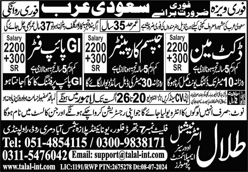 Talal International Overseas Employment Promoters is looking for candidates for following posts as per job advertisement published in daily Express Newspaper of August 7, 2024 for location Dammam, riyadh Saudi Arabia: