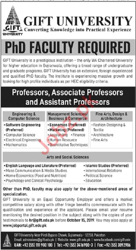 Gift University is looking for qualified and well educated candidates for the positions of Associate Professor, Assistant Professor, Computer Science Professor, Electrical Engineering Professor, Mathematics Professor, Accounting Professor, Finance Professor, Human Resource Professor, Quantitative Techniques Professor, Fashion Designing Professor, Textile Designing Professor, Architecture Professor, Fine Arts Professor, English Language Professor and Islamic Studies Professor in Gujranwala.