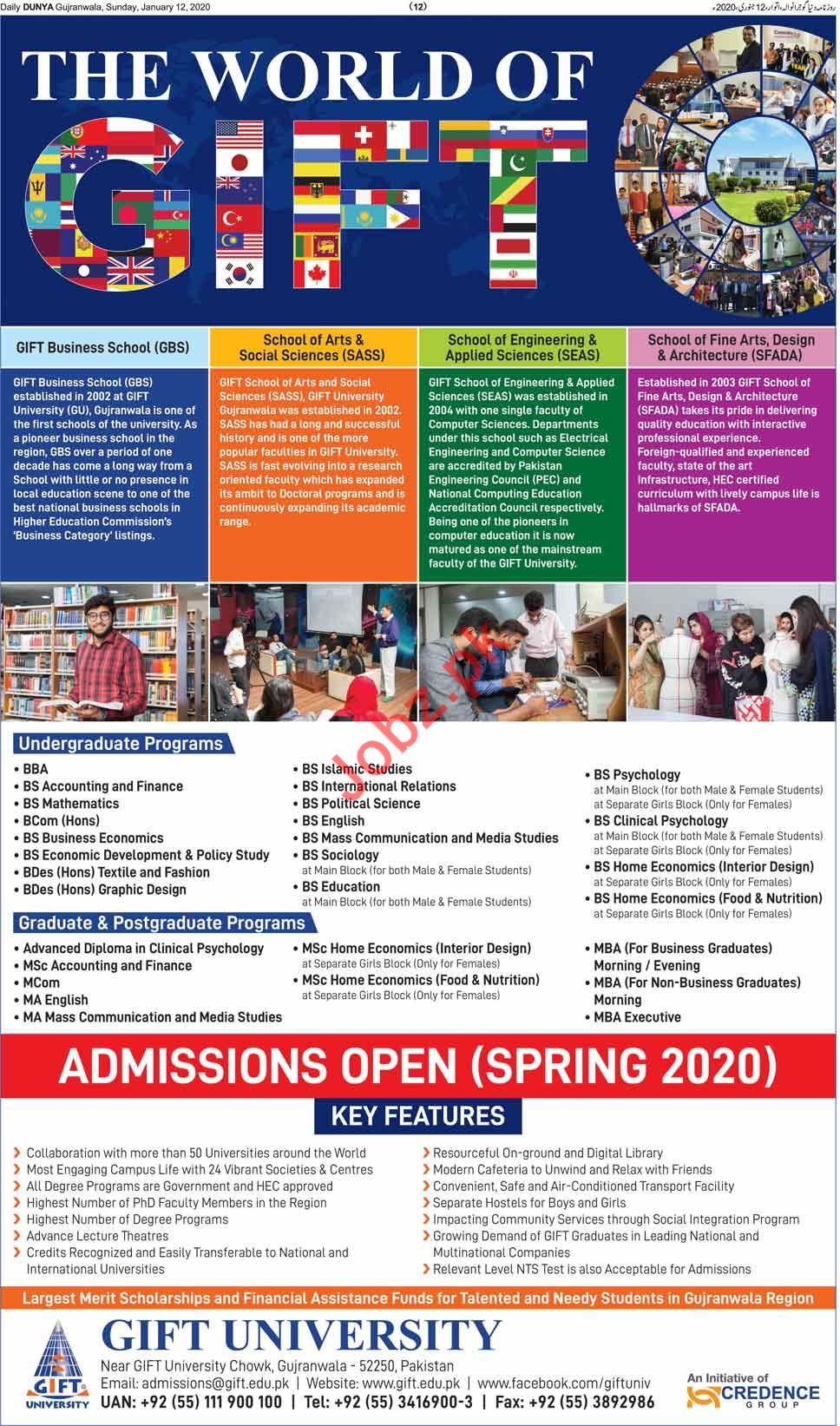 A chartered University named GIFT University has announced Spring Admissions 2020 for the degree of BBA, BS, B.com, BDeS, Diploma, Msc, MA, MBA, BS Education in Gujranwala. Read newspaper ad for exact details.