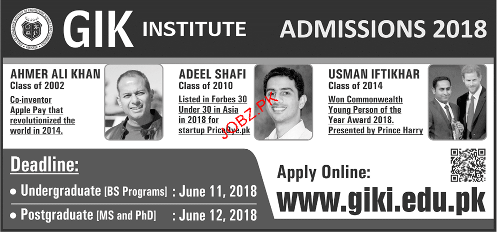 GIK Ghulam Ishaq Khan Institute of Science and Technology Admission in Undergraduate Programs BS Programs and Postgraduate Programs Ms and Phd in Swabi. Read newspaper ad for exact details.