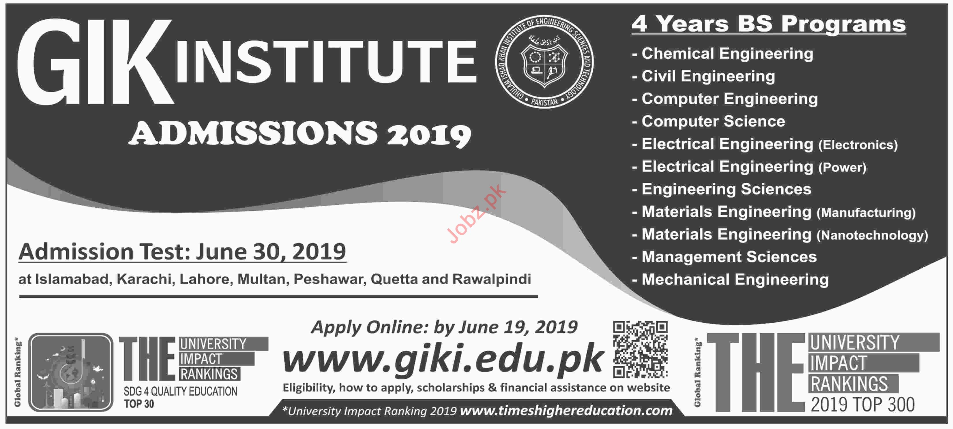 Ghulam Ishaq Khan Institute of Engineering Sciences and Technology is offering admissions for 4 Years BS Chemical Engineering Programs, BS Civil Engineering Programs, BS Computer Engineering Programs, BS Computer Science Programs, BS Electrical Engineering Programs, BS Engineering Sciences Program, BS Management Sciences, BS Mechanical Engineering in Swabi KPK 2019. Read newspaper ad for exact details.