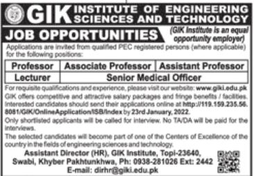 GIK Institute of Engineering Sciences & Technology jobs advertisement dated about 15 January 2022 in daily Jang Newspaper invites application for the vacant post of Medical Officer, Professor, Assistant Professor, Associate Professor and Lecturer in Swabi Khyber Pakhtunkhwa KPK Pakistan. MBBS, Master, Mphil, Phd and MS etc. educational qualification will be preferred.