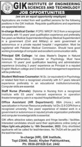 GIK Institute of Engineering Sciences & Technology jobs advertisement dated about 3 December 2022 in daily Jang Newspaper invites application for the vacant post of student wellness counselor, office assistant, incharge medical center, staff nurse and principal gik college in Swabi, swabi Khyber Pakhtunkhwa KPK Pakistan. Persons with P.G Diploma, Others, Master, BBA and M.sc etc. education can apply.