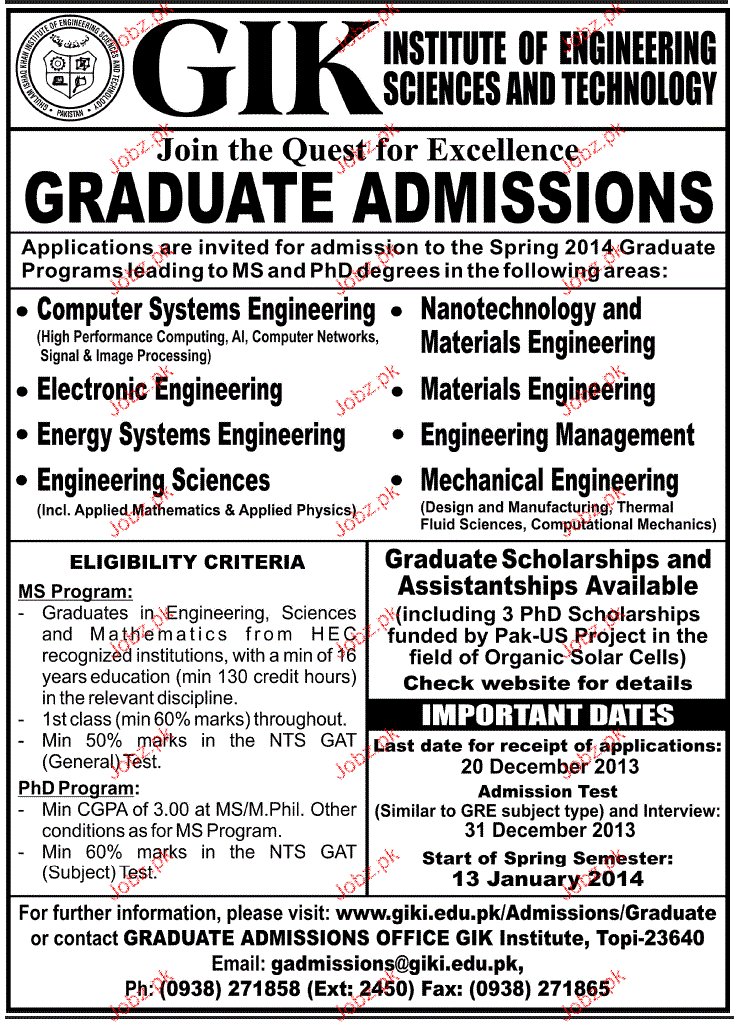 GIK Institute of Engineering Sciences and Technology Admission in Graduate Engineering in Sawabi Read newspaper ad for exact details.