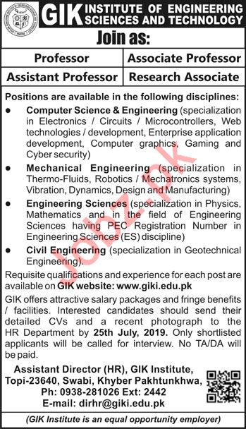 Vacancies in GIK Institute of Engineering Sciences & Technology Advertisement July 2019