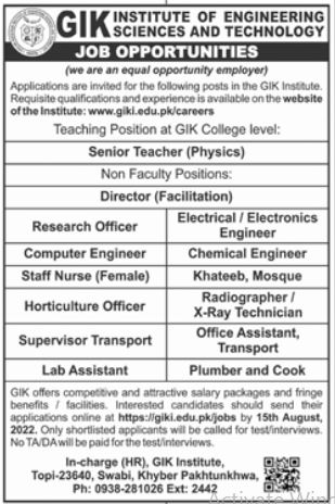 Vacant posts including lab assistant, plumber, electrical engineer, staff nurse, chemical engineer, horticulture officer, research officer, computer engineer, radiographer, cook and supervisor transport are announced in GIK Institute of Engineering Sciences & Technology Peshawar, peshawar Khyber Pakhtunkhwa KPK Pakistan as per 3 August 2022 advertisement in daily Jang Newspaper. Educational qualifications required Phd, Master, Mphil and Bachelor etc.