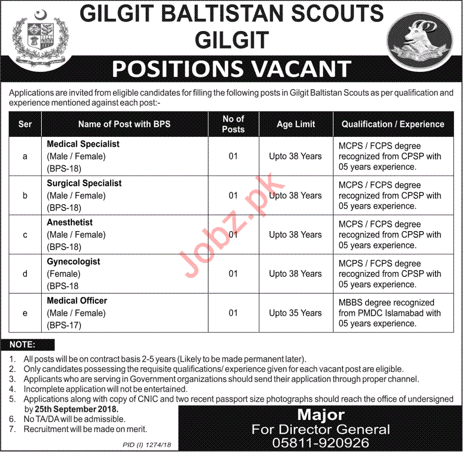 Gilgit Baltistan GB Scouts Medical Jobs 2018