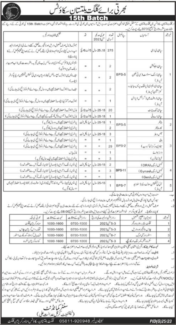 Gilgit Baltistan Scouts, Pakistan Army Gilgit, shigar, gilgit, astore, ghizer, skardu, hunza and nagar valley Gilgit Baltistan Pakistan invites applications from eligible candidates for the post of it technician software, graphic design operator, sweeper, machine operator, it technician, sepoy at, emale aya, draftsman, nurser, general nurse, mess waiter, mali, cutter, carpenter, sepoy, cook unit, printing press operator, sepoy nursing assistant, gynae nurse, sepoy gd, aya, sepoy education, sanitary worker, ct scan operator, binder, sepoy eme, painter, sepoy cook unit, sepoy draftsman, nurse operation and ward boy as per advertisement of April 20, 2023 published in daily Other Newspaper. Candidates with BCS, M.sc, Intermediate, Middle, DAE, Matric and Primary etc. educational background will be preferred.