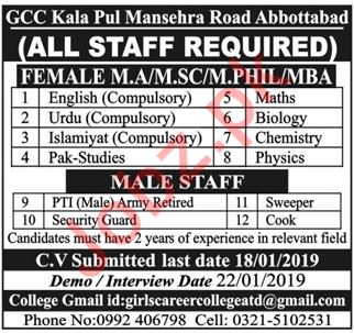 Qualified and well educated candidates for the positions of English Teacher, Maths Teacher, Biology Teacher, Chemistry Teacher, Physics Teacher, Urdu Teacher, Islamiyat Teacher, Pak Studies Teacher, PTI, Sweeper, Cook & Security Guard required for Girls Cadet College in Abbottabad KPK 2019.
