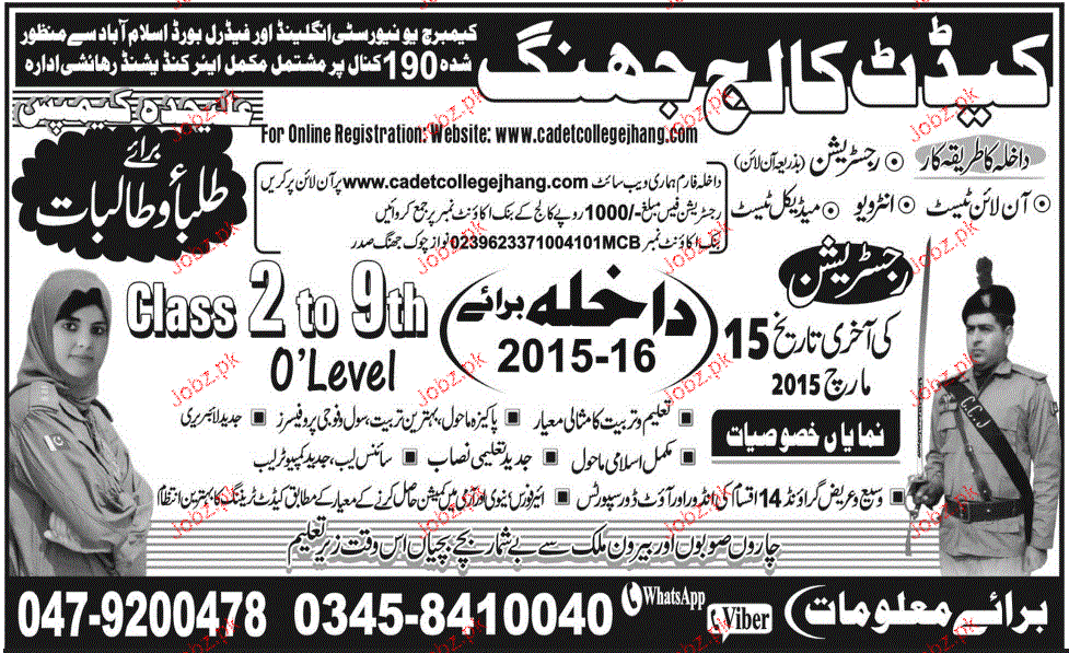 Girls Cadet College Jhang Admission in Class II to IX in Jhang. Read newspaper ad for exact details.