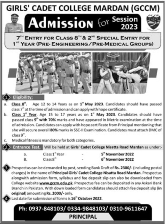 Shaheed Benazir Bhutto Girls Cadet College Class 8th, 9th Class & Intermediate Part I, Fsc Pre Medical, FSc Pre Engineering, ICS Computer Science admissions 2022 has been started. Students who want to take admissions in Shaheed Benazir Bhutto Girls Cadet College Mardan Khyber Pakhtunkhwa KPK Pakistan for academic year 2022 to continue education in Army College can apply. Students who want to enroll for academic session 2022 in Matric, Middle and Intermediate qualification and admission criteria for Government institute can apply till last date 16 October 2022. Read newspaper ad for exact details.